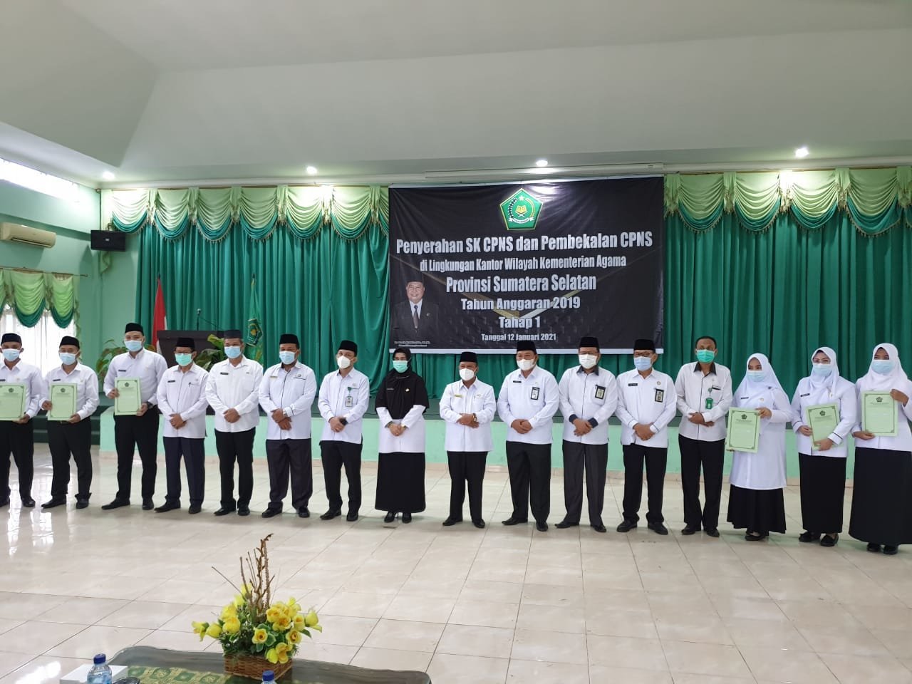 Palembang, KRSumsel.com – Kakanwil Kemenag Sumsel Dr. Drs. H. Mukhlisuddin SH, MA menyerahkan surat keputusan (SK) kepada 87 calon pegawai negeri sipil (CPNS) Kemenag Sumsel di Aula Pusat Informasi Haji (PIH) Palembang, Selasa (12/1). Pada kesempatan tersebut, Mukhlisuddin berharap para aparatur Kementerian Agama Sumatera Selatan memahami aturan dan memiliki etika dalam bekerja.