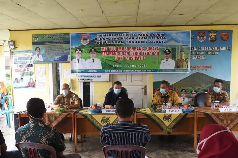 PAGARALAM, KRSUMSEL.COM- Walikota PagarAlam Alpian Maskoni hadir serta membuka langsung, Musyawarah Perencanaan Pembangunan (Musrenbang) Tahun 2021 tingkat Kelurahan di wilayah Kecamatan Pagar Alam Selatan, Bertempat di Kelurahan Tanjung Agung, Kecamatan Pagar Alam Selatan, Kamis (14/01/2021).