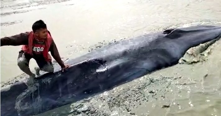 Dalam rekaman video terlihat salah seorang pria tengah menaiki badan paus yang terlihat luka di bagian bawah badan dekat ekornya. Kondisi ikan tersebut masih hidup.