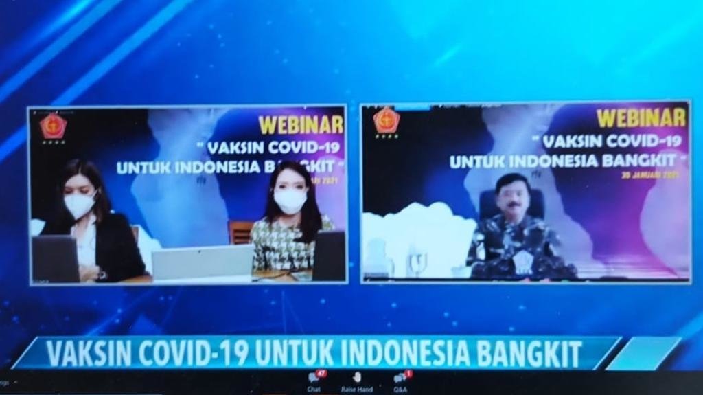 Acara Webinar yang bertajuk “Vaksin Covid-19 untuk Indonesia Bangkit” tersebut menghadirkan beberapa narasumber seperti Menteri Kesehatan RI Budi Gunadi Sadikin, Ketua MUI KH. Cholil Nafis dan Anggota Satgas Covid-19 dari Perhimpunan Dokter Spesialis Penyakit Dalam (PAPDI) Dr. dr. Sukamto Koesno Sp.PD.(****)