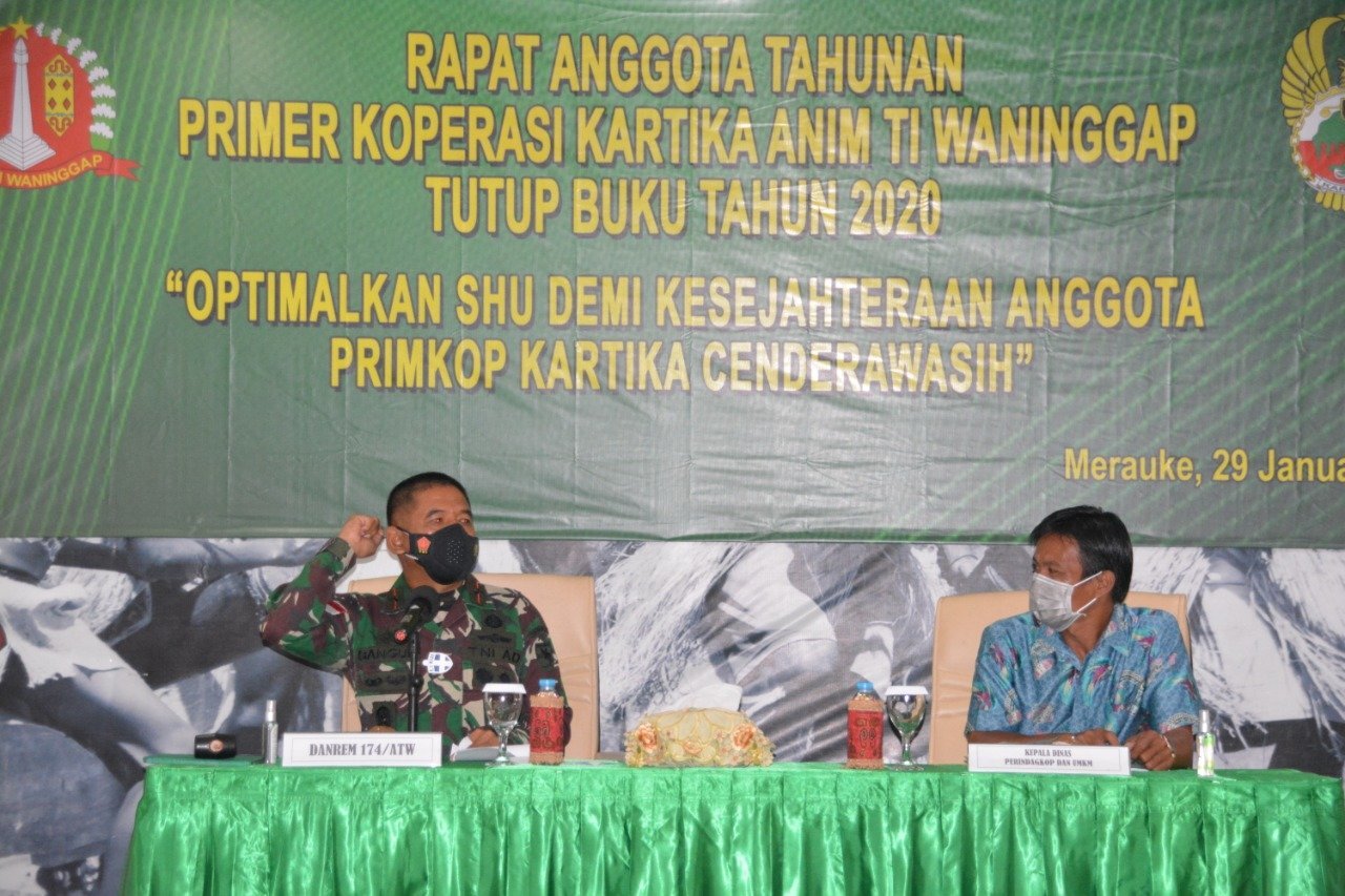 Merauke, KRsumsel.com – Danrem 174/ATW Merauke Brigjen TNI Bangun Nawoko memimpin Rapat Anggota Tahunan (RAT) dan Tutup Buku Tahun 2020 Primer Koperasi (Primkop) Kartika Anim Ti Waninggap, bertempat di Ruang Rekreasi Makorem 174/ATW, Jumat (29/1/2021).