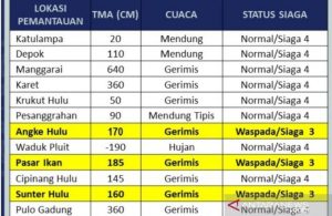BPBD DKI mencatat kenaikan status dari normal atau siaga IV menjadi waspada atau siaga III itu terjadi pada pukul 04.00 WIB karena curah hujan yang tinggi menyebabkan kenaikan tinggi muka air.