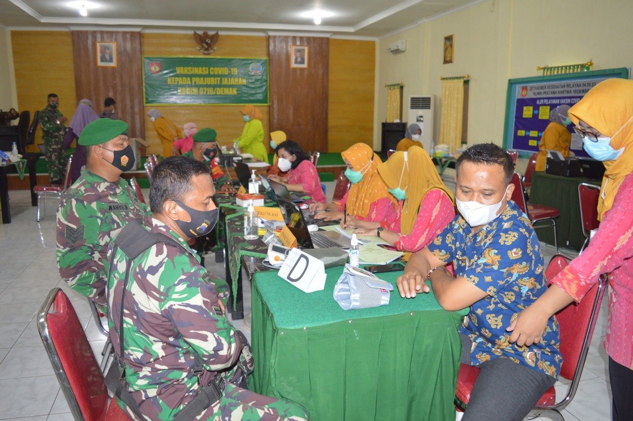 Melalui Pasi Ops Kodim 0716 Demak Kapten Arh Jalalul Hadi saat di temui mengatakan, vaksinasi yang dilakukan saat ini sebagai dukungan terhadap program pemerintah, khususnya di lingkungan Kodim 0716 Demak.