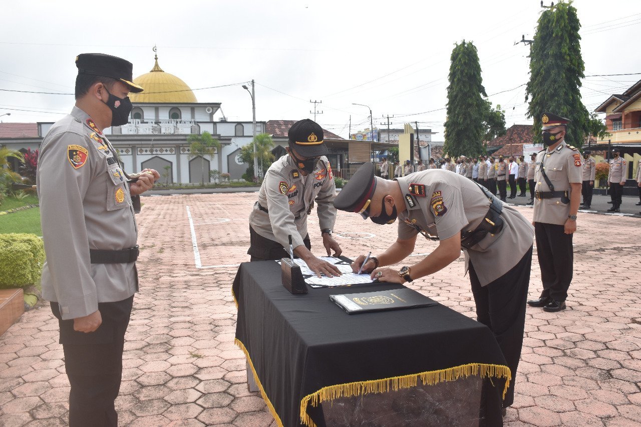 Upacara sertijab dipimpin oleh kapolres Muba Akbp Erlin Tangjaya, SH, S.ik ditandai dengan pelepasan tanda jabatan dan pangkat dari pejabat lama, untuk dikenakan pada pada pejabat baru. Dilakukan juga penandatanganan berita acara sertijab, penandatanganan pakta integritas dan pengambilan sumpah jabatan.