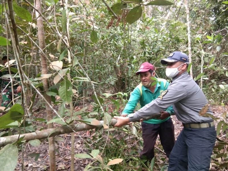 Pantauan di lapangan, warga Desa Sungai Terap dan Satgas TMMD harus masuk ke hutan untuk mencari pohon pelangas.