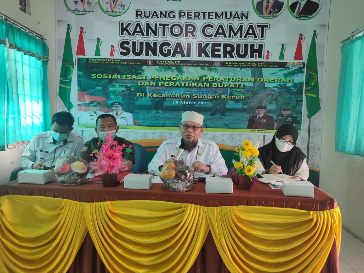 MUBA, KRSUMSEL.com – Sebagai Upaya berikan pemahaman kepada seluruh stakeholder dan masyarakat Pemerintah Kabupaten Musi Banyuasin melalui Satuan Polisi Pamong Praja Muba, melakukan sosialisasi tentang beberapa Peraturan Daerah dan Peraturan Bupati yang ada di Bumi Serasan Sekate, di Aula Kantor Camat Sungai Keruh, Senin (15/3/2021).