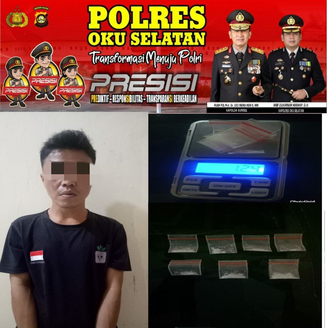 Pada saat dilakukan penggeledahan di dalam rumah tersangka, ditemukan 7 (tujuh) paket kecil yang berisi kristal warna putih yang diduga narkotika Jenis sabu dengan berat bruto 1.24 gr. Setelah dilakukan introgasi Barang bukti tersebut diakui milik tersangka,”jelas Kasat.