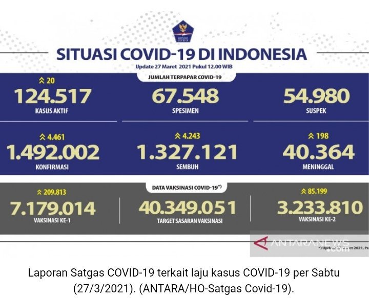 Kemudian 1.327.121 orang telah dinyatakan sembuh dan 40.364 jiwa meninggal dunia sejak kasus pertama COVID-19 terkonfirmasi di Indonesia pada Maret 2020.