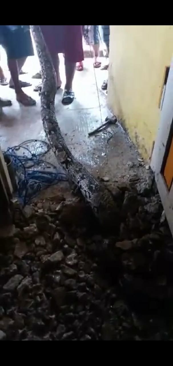 “Pemilik rumah lagi pergi, yang bongkar lantai itu tukang bangunan. Jadi ketika di bongkar lantainya yang berada di depan pintu rumah, tukang bangunan itu melihat ada ular Sanca,” Jelas Suprapto, tetangga nya, ketika ditemui di lokasi penemuan ular.