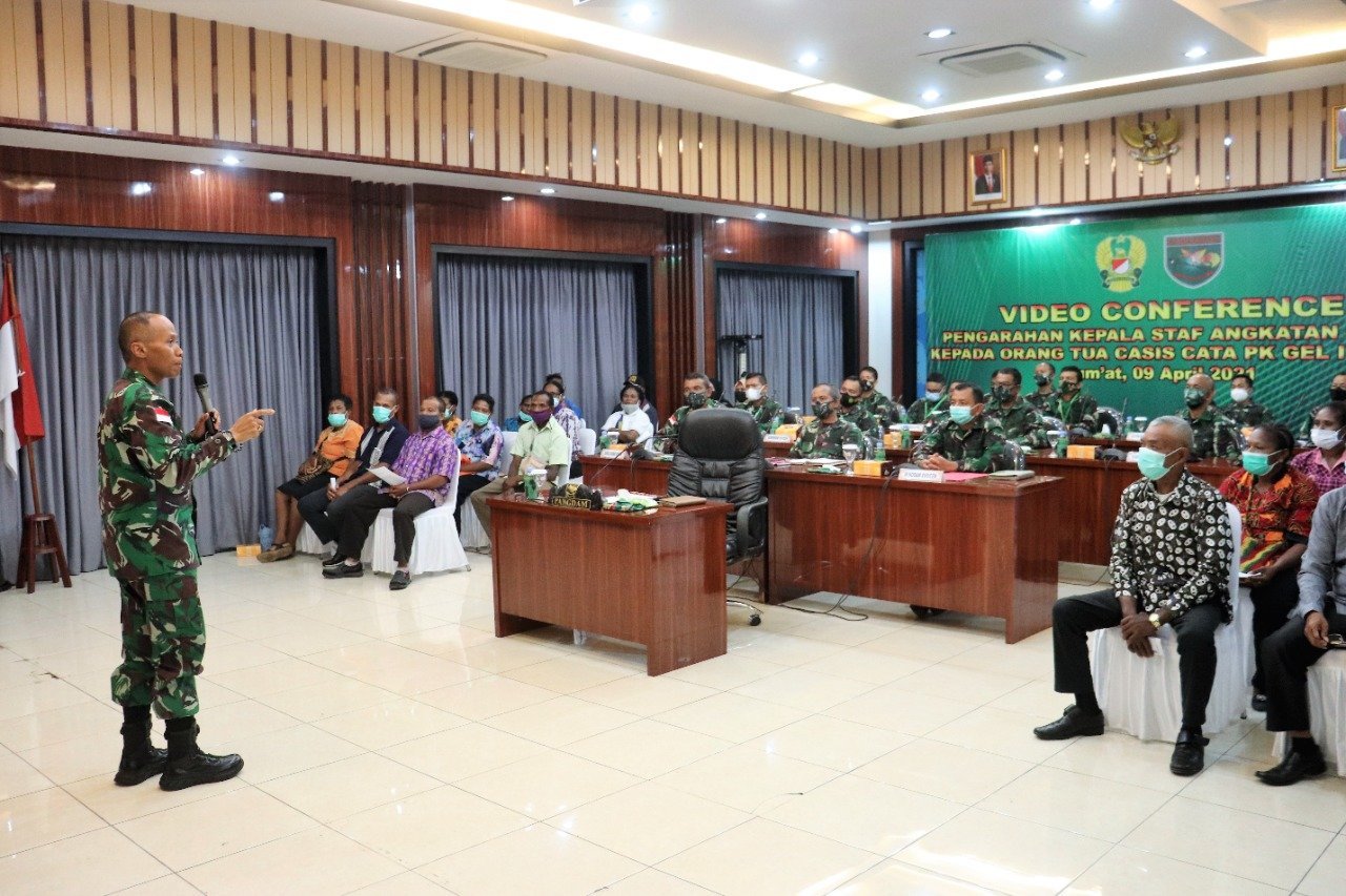 Jayapura, KRsumsel.com – Pangdam XVII/Cenderawasih Mayjen TNI Ignatius Yogo Triyono, M.A. bersama para orang tua dari peserta Calon Siswa Tamtama PK TNI AD Gel I Tahun 2021 mendengarkan arahan dari Kepala Staf Angkatan Darat (Kasad) Jenderal TNI Andika Perkasa terkait pelaksanaan tes Werving melalui Video Conference, di Ruang Bina Yudha Makodam XVII/Cenderawasih, Jayapura, Jumat (9/4/2021).