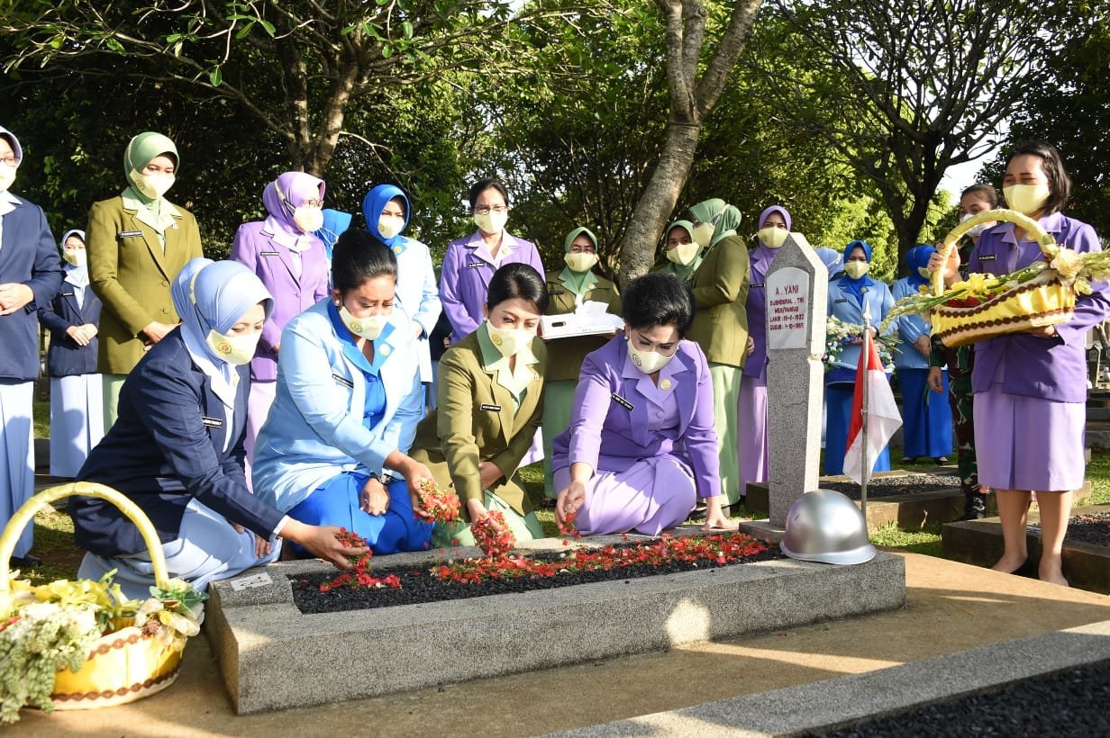 Jakarta, KRsumsel.com – Ketua Umum (Ketum) Dharma Pertiwi Ny. Nanny Hadi Tjahjanto didampingi Ketum Persit Kartika Chandra Kirana Ny. Hetty Andika Perkasa, Ketum Jalasenastri Ny. Veronica Yudo Margono dan Ketum PIA Ardhya Garini Ny. Inong Fadjar Prasetyo, melaksanakan ziarah dan tabur bunga dalam rangka HUT Ke-57 Dharma Pertiwi Tahun 2021, di Taman Makam Pahlawan Nasional Utama (TMPNU) Kalibata, Jakarta Selatan, Senin (12/4/2020).