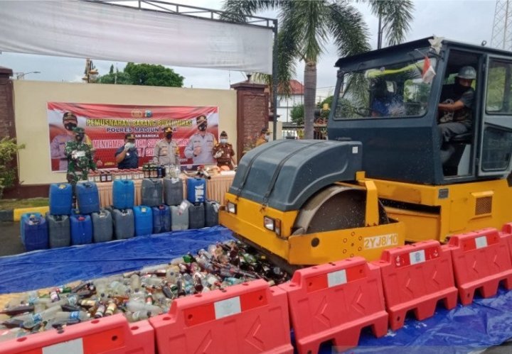 Selain premanisme dan prostitusi, Polres Magetan juga memberantas kasus peredaran minuman keras. Sebanyak 261,5 liter minuman keras hasil sitaan selama Januari-April telah dimusnahkan dengan dibuang ke saluran air. Ratusan liter arak Bekonang dan oplosan itu diamankan dari 13 tersangka.
