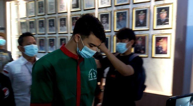 Terlihat bintang sinetron Putri untuk Pangeran itu mengenakan baju tahanan narkoba berwarna hijau dan celana putih. Tangannya pun terlihat diborgol.