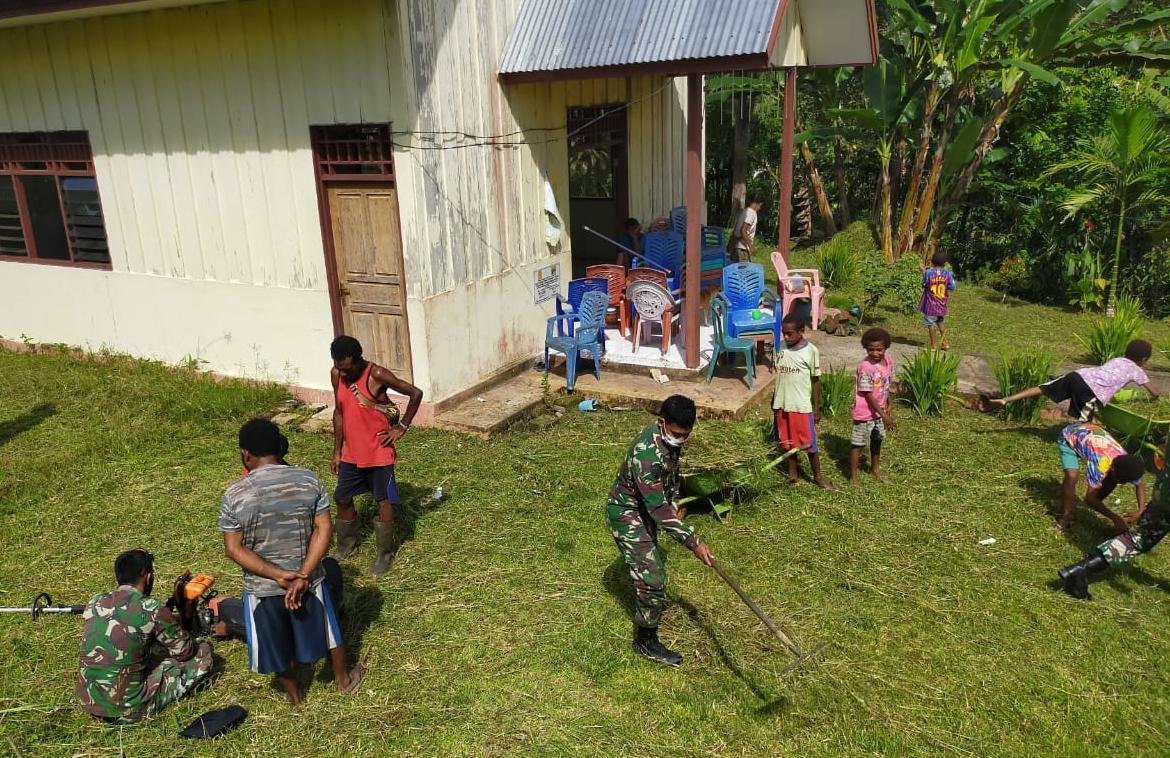 Keerom, KRSUMSEL.com – Anggota Pos Kalilapar Satgas Pamtas RI-PNG Yonif Mekanis 512/QY melaksanakan Karya Bhakti bersama warga membersihkan lingkungan Gereja Katolik Emanuel Stasi Sach di Kampung Sach Distrik Waris, Kabupaten Keerom, Papua. Selasa (20/04/21).