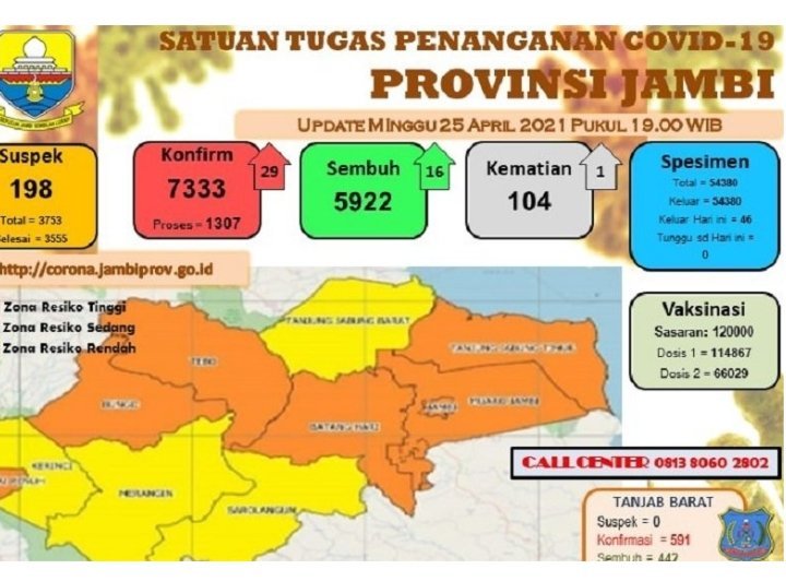 Pasien yang masih menjalani proses isolasi dan perawatan baik di rumah sakit umum daerah dan secara mandiri di daerah itu berjumlah 1.307 orang. Dan pasien yang meninggal karena COVID-19 di daerah itu berjumlah 104 orang. Dimana pada hari ini terdapat satu orang lansia asal Kabupaten Tanjung Jabung Barat yang meninggal karena COVID-19.