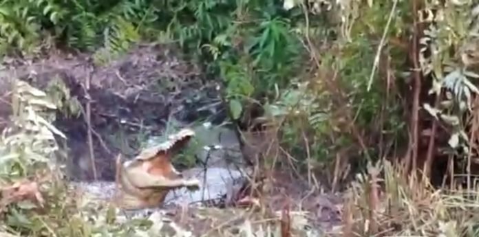 BANYUASIN.KRSumsel.com – Buaya ukuran kurang lebih 2 meter muncul di persawahan dekat Sumur Belanda Dusun III Desa Mukut Kecamatan Pulau Rimau Kabupaten Banyuasin, Selasa (25/05/2021). Kemunculan Buaya tersebut membuat panik warga yang melihat karena buaya tersebut terlihat ganas.