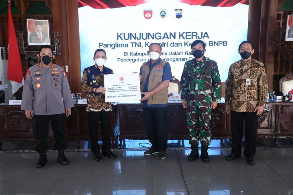 Jakarta, KRsumsel.com – Panglima TNI Marsekal TNI Hadi Tjahjanto, S.I.P., didampingi Kapolri Jenderal Pol Drs. Listyo Sigit Prabowo, M.Si., dan Kepala BNPB Letjen TNI Ganip Warsito, S.E., M.M., melaksanakan kunjungan kerja dan rapat terkait penanganan Covid-19 di Kabupaten Pati Jawa Tengah, bertempat di pendopo kabupaten Pati, Sabtu (5/6/2021).
