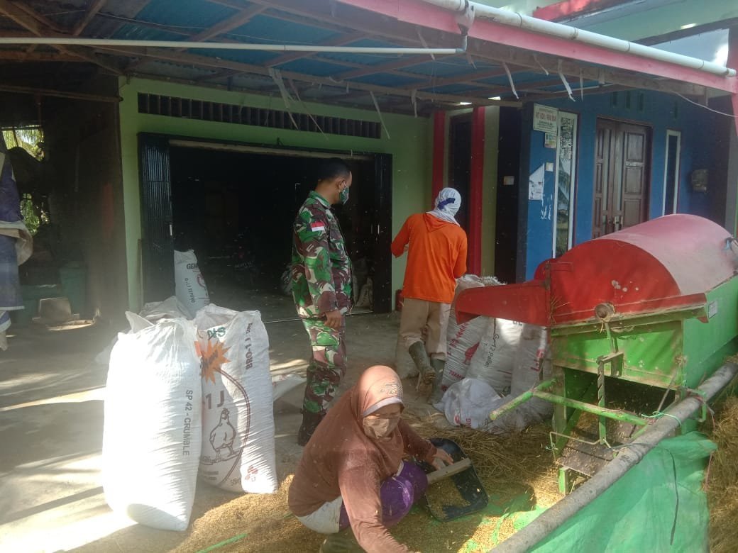 Usai panen padi bersama dengan petani padi desa binaannya, Babinsa juga ikut membantu petani lakukan perontokan padi dengan menggunakan mesin perontok padi di sawah milik Pak Hamdan, yang sawahnya sudah selesai dipanen.
