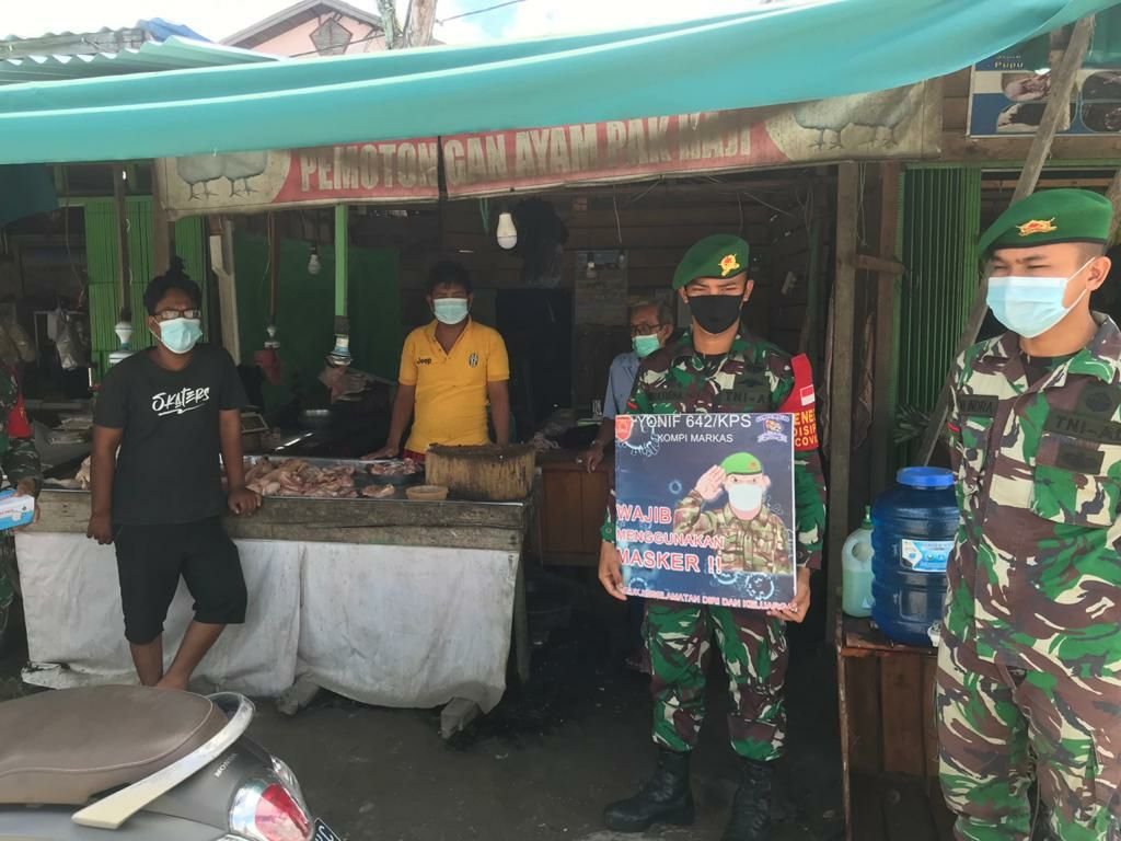 Sintang, KRsumsel.com – Untuk mencegah penyebaran Covid-19, Prajurit TNI dari Batalyon Infanteri 642/Kapuas membagikan masker di Pasar Sui Durian, Sintang, Kalbar, Rabu (9/6/2021).