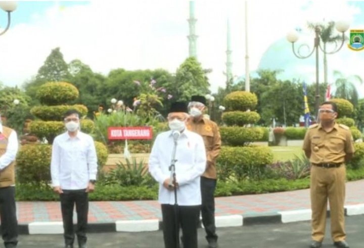 “Pak Gubernur kemarin saya pergi ke wilayah Tangerang dan banyak warga tak menggunakan masker. Ini harus digalakkan penerapan protokol kesehatan,” kata Wapres kepada Gubernur Banten Wahidin Halim yang berdiri di belakangnya.