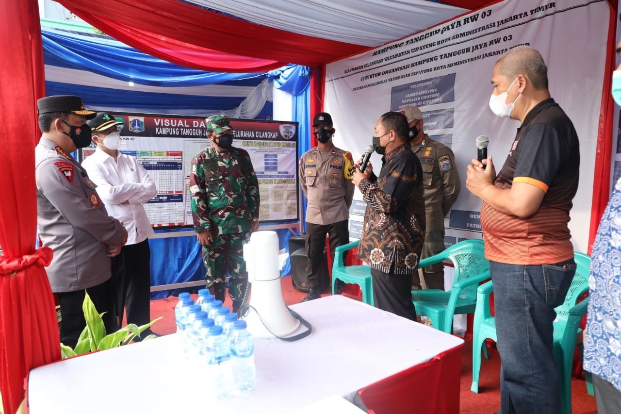Setelah sampai dilokasi, Panglima TNI, Kapolri, Menkes dan Ka BNPB menyempatkan diri berdialog dengan Bapak Roshadi selaku Ketua RW 03 didampingi oleh Danramil Cipayung, Kapolsek Cipayung dan Wakil Camat Cipayung, untuk mengetahui keadaan di lingkungan tersebut serta penanganan terhadap masyarakat yang positif Covid-19.