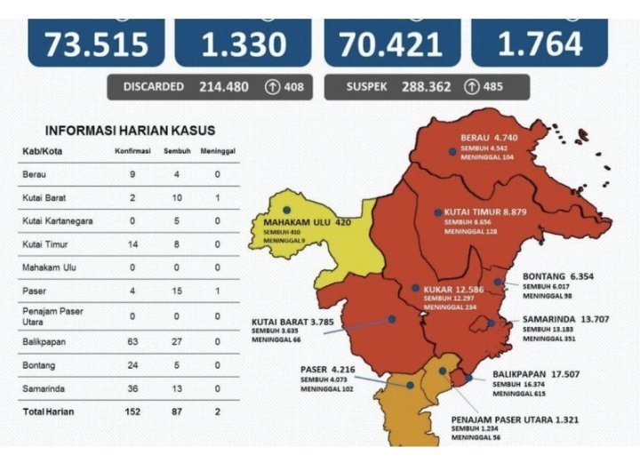 ” Akumulasi kasus terkonfirmasi positif COVID-19 di Kaltim sebanyak 73.515 kasus, sedangkan kasus yang telah dinyatakan sembuh sebanyak 70.421 kasus,” kata Andi Muhammad Ishak.