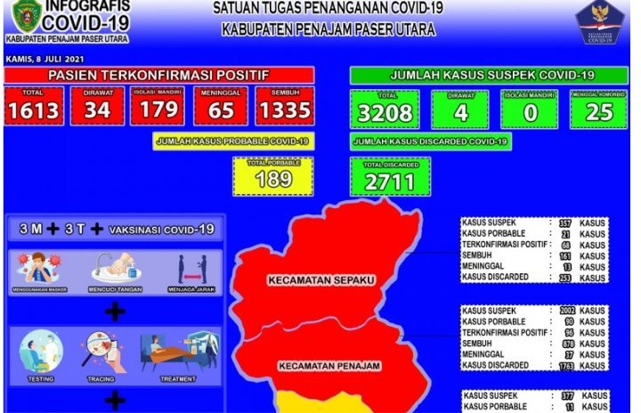 Jika dirinci per kecamatan, perkembangan dari total positif sebanyak 1.613 orang tersebut adalah di Kecamatan Penajam masih ada 96 orang positif, 878 orang sembuh, dan 37 orang meninggal.