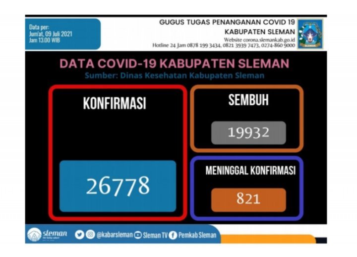 Sleman, KRsumsel.com – Satuan Tugas (Satgas) Penanganan COVID-19 Kabupaten Sleman, Daerah Istimewa Yogyakarta mencatat terjadi penambahan kasus konfirmasi positif COVID-19 di wilayah itu pada Jumat (9/7) sebanyak 619 kasus, dan merupakan tertinggi dalam kasus harian.