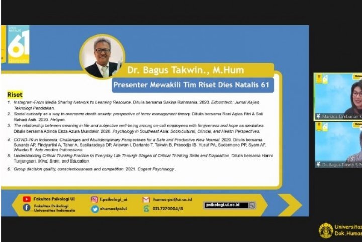 Peneliti utama dalam tim ini sekaligus presenter yang membawakan hasil riset pada webinar bertajuk “Resiliensi di Masa Pandemi: Studi tentang Resiliensi dan Dampaknya Terhadap Kesehatan Mental pada Orang Indonesia”. Webinar dilaksanakan secara daring yang dihadiri 614 peserta melalui platform zoom pada Sabtu.
