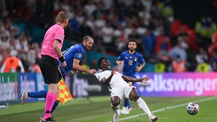 Momen pelanggaran Giorgio Chiellini terhadap Bukayo Saka itu terjadi di penghujung waktu normal partai final Euro 2020 di Wembley, Senin (12/7/2021) dini hari WIB. Bek 36 tahun itu dilewati Saka, tapi kemudian tak membiarkan winger Arsenal itu melesat dengan menarik kausnya.