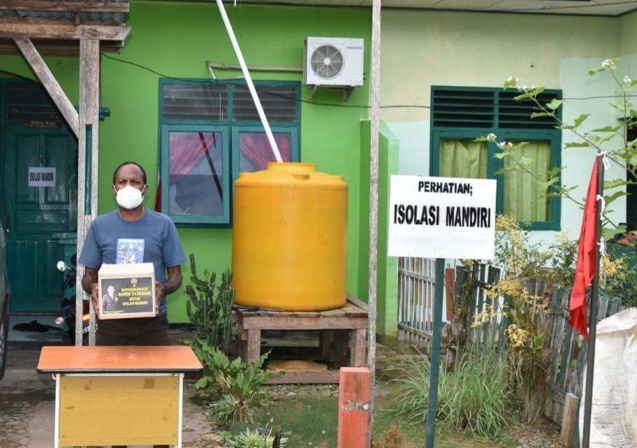 Merauke, KRsumsel.com – Komandan Korem (Danrem) 174 Merauke Brigjen TNI Bangun Nawoko memberikan bingkisan kepada prajurit yang terpapar virus Covid-19, yang melaksanakan isolasi mandiri, Senin (19/07/2021).