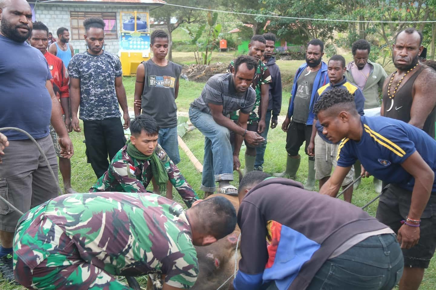 Usai melaksanakan Shalat Idul Adha, personel Pos Kotis Satgas Pamrahwan Yonif RK 751/VJS membantu masyarakat Distrik Walesi melaksanakan penyembelihan hewan qurban sebanyak 5 ekor sapi di halaman Masjid Al-Aqsho, yang dihadiri pula oleh Tokoh Masyarakat Suku Walesi H. Abu Hanifa Asso.
