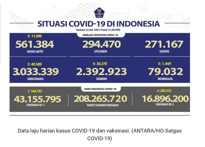 Jakarta, KRsumsel.com -Gugus Tugas (Satgas) Penanganan COVID-19 melaporkan masyarakat yang telah menerima vaksin dosis pertama mencapai 43.155.795 orang hingga 22 Juli 2021 pukul 12.00 WIB.