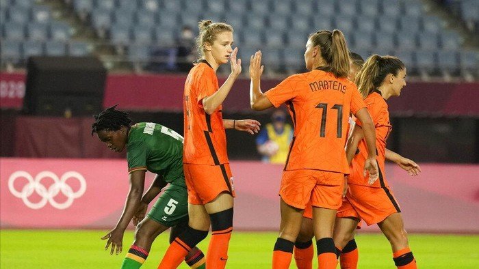 Miyagi – Duel cabang sepakbola putri di di Olimpiade Tokyo 2020, Zambia vs Belanda, menghadirkan pesta gol. Ada dua pemain bikin hat-trick, De Oranje menang 10-3.