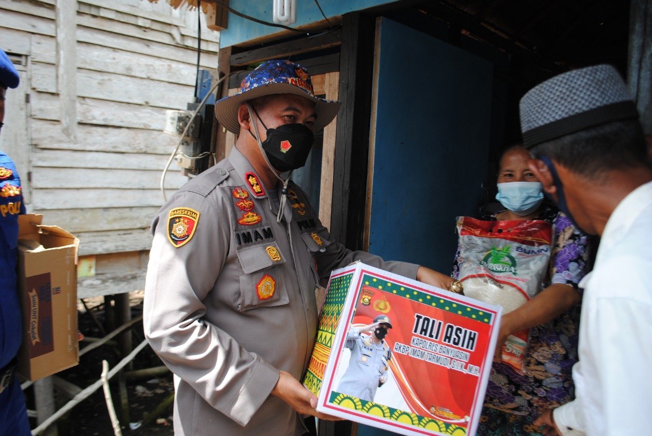Kapolres AKBP Imam Tarmudi juga terjun langsung ikut serta membagikan sembako kepada masyarakat di pesisiran sungai desa gasing dan desa tanjung lago.