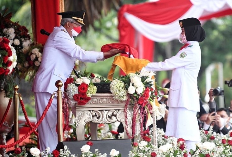 PALEMBANG, KRsumsel.com – Meskipun diguyur hujan gerimis upacara Penurunan Bendera Merah Putih HUT Kemerdekaan RI ke 76 Tahun 2021 di halaman Istana Gubernur Griya Agung Palembang, Selasa (17/8) sore tetap berjalan dengan suksesk