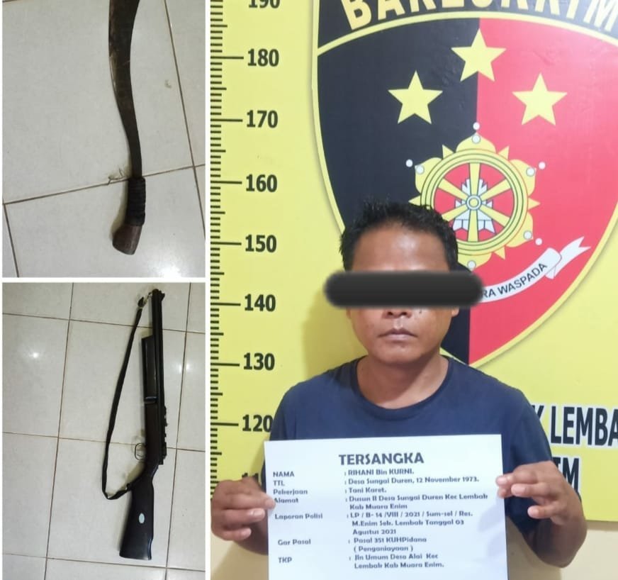 Tiba di tempat dimana pelaku berada, Aipda Heri Defriansyah SH dan anggota Sat Reskrim Polsek Lembak yang melihat pelaku yang saat itu hendak melarikan diri karna melihat Anggota Sat Reskrim langsung dihadang dan pelaku berhasil diamankan beserta barang bukti berupa satu pucuk Senapang Angin Merk Canon warna hitam dan satu bilah parang dengan panjang 60 cm.