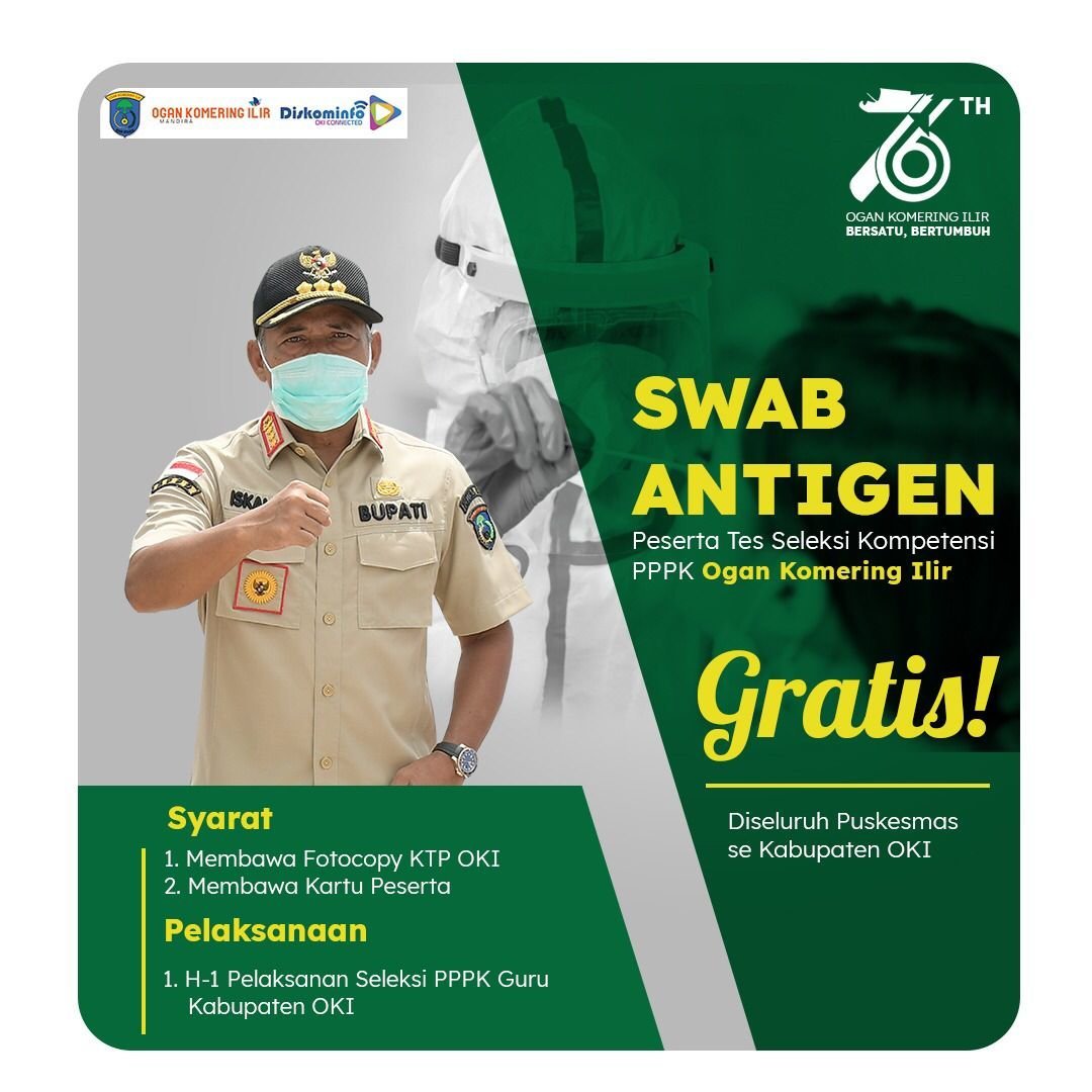 OKI, KRsumsel.com –Pemerintah Kabupaten Ogan Komering Ilir memberikan layanan rapid antigen gratis untuk peserta seleksi P3K tahun 2021 khusus bagi masyarakat yang memiliki KTP dan melamar formasi di Kab. Ogan Komering Ilir. Rapid antigen bisa dilakukan di puskemas terdekat.