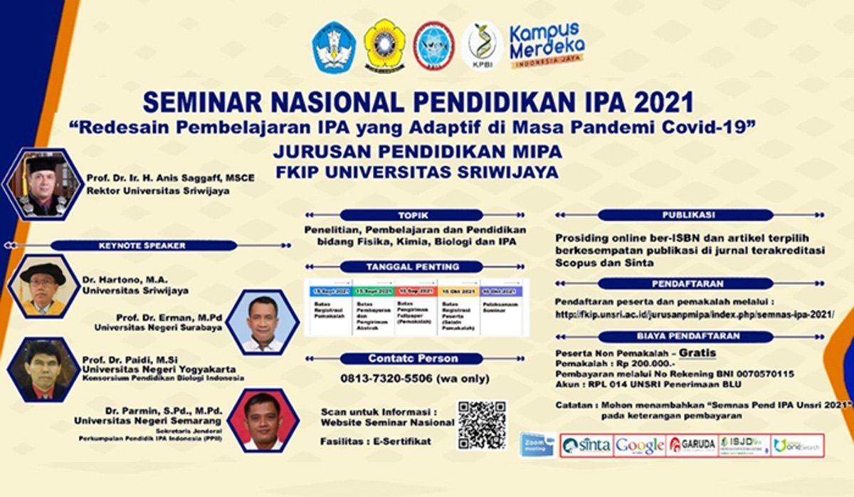 Untuk menjembatani kepedulian dan pemahaman perubahan pembelajaran IPA tersebut, Jurusan Pendidikan MIPA Fakultas Keguruan dan Ilmu Pendidikan (FKIP) Universitas Sriwijaya akan menyelenggarakan Seminar nasional IPA yang mengusung tema Re-Desain Pembelajaran IPA yang Adaptif di Masa Pandemi Covid-19 yang akan dilaksanakan pada Sabtu 16 Oktober 2021, melalui live on Zoom dan juga youtube channel FKIP Unsri