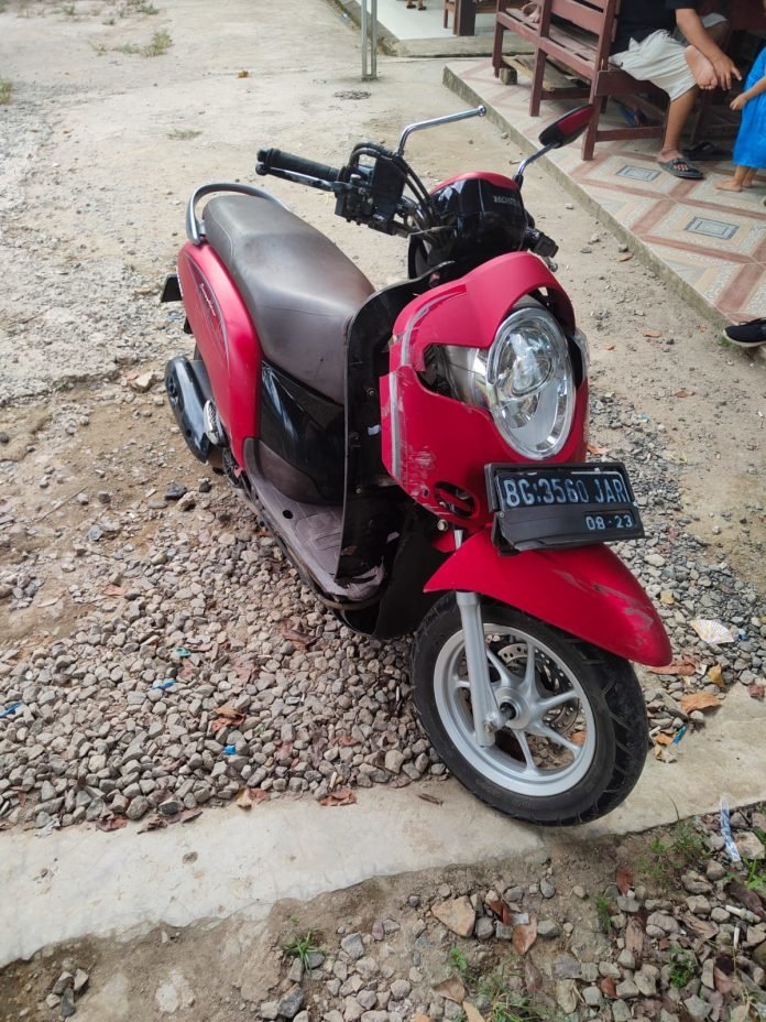 “Akibat kejadian tersebut pengendara Spd Mtr Ymh Scoopy BG 3560 JAR an.FEBRIO mengalami luka robek di paha sebelah kanan, Luka robek di pelipis mata kanan dan penumpangnya an,DWI UTAMI mengalami luka patah di tangan kanan,luka robek di tangan kanan dibawa,” jelas Ricky.