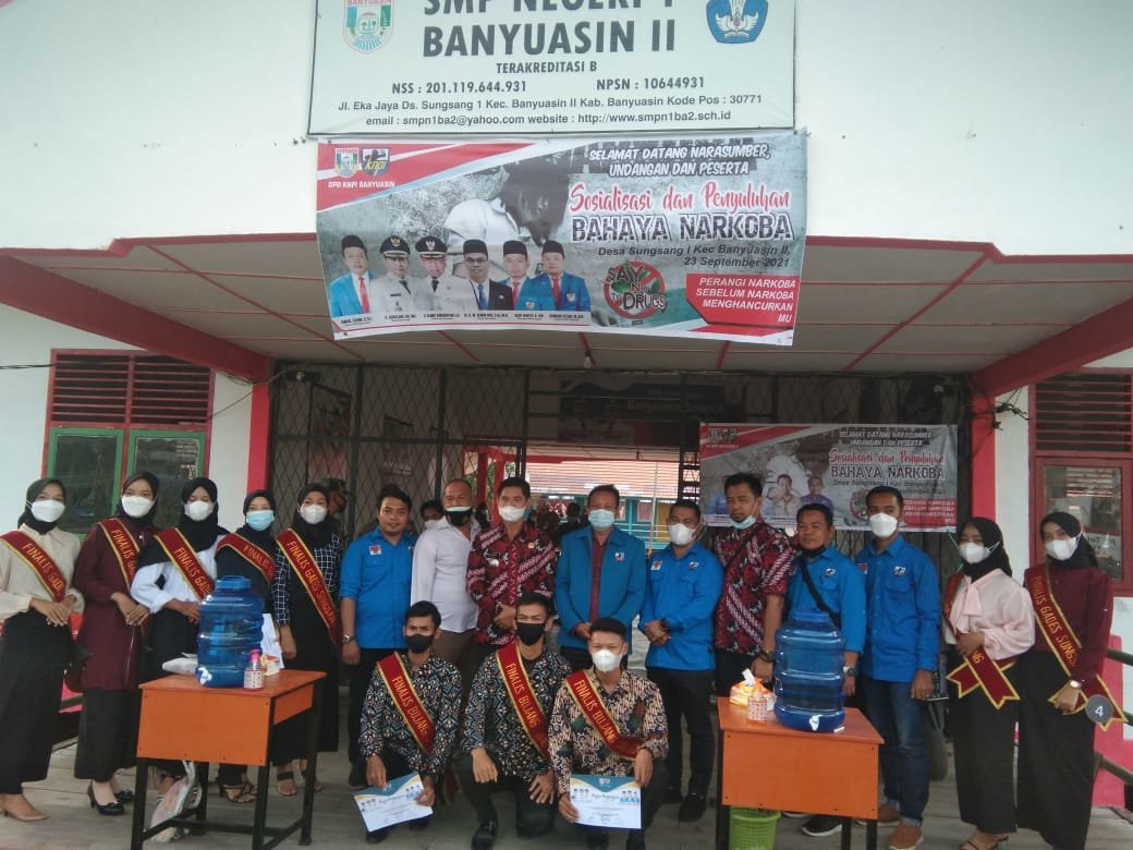 BANYUASIN.KRSumsel.com – Dewan Pengurus Daerah (DPD) Komite Nasional Pemuda Indonesia (KNPI) Banyuasin dan PK KNPI Kecamatan Banyuasin II laksanakan sosialisasi tentang bahaya narkoba bagi pelajar, pemuda dan masyarakat yang di pusatkan di SMP Negeri 1 Desa Sungsang I Kecamatan Banyuasin II Kabupaten Banyuasin.