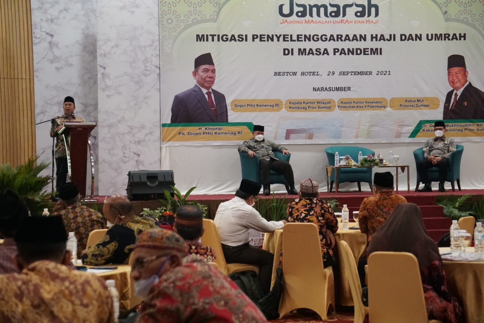 Palembang, KRsumsel.com – Bidang Penyelenggaraan Haji dan Umrah (PHU) Kanwil Kemenag Sumsel menggelar kegiatan Jagong Masalah Umrah dan Haji (Jamarah) di Hotel Beston Palembang, Rabu (29/9). Kegiatan ini diikuti 100 peserta dan dibuka Kakanwil Kemenag Sumsel Dr. Drs. H. Mukhlisuddin SH, MA.