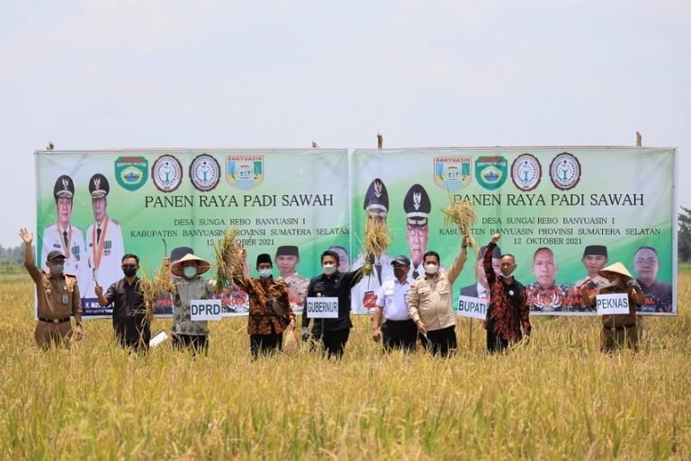 BANYUASIN.KRSumsel.com – Bersama Gubernur Sumsel H Herman Deru, Bupati Banyuasin H Askolani, Selasa (12/10/2021) untuk kesekian kalinya melaksanakan Panen Raya bersama. Kali ini mereka berdua melakukan panen raya pada lahan sawah di Desa Sungai Rebo Kabupaten Banyuasin, Sumsel.