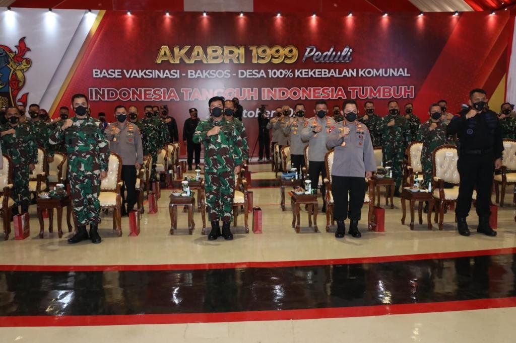 Hal tersebut disampaikan Panglima TNI Marsekal TNI Hari Tjahjanto, S.I.P., bersama Kapolri Jenderal Pol Drs. Listyo Sigit Prabowo, M.Si., saat memberikan sambutan pada kegiatan serbuan Vaksinasi yang digelar oleh Alumni Akabri 1999 (TNI AD, TNI AL, TNI AU dan Polri), bertempat di Gedung Satya Haprabu Korps Brimob Polri, Kota Depok, Prov. Jawa Barat, Rabu (20/10/2021).