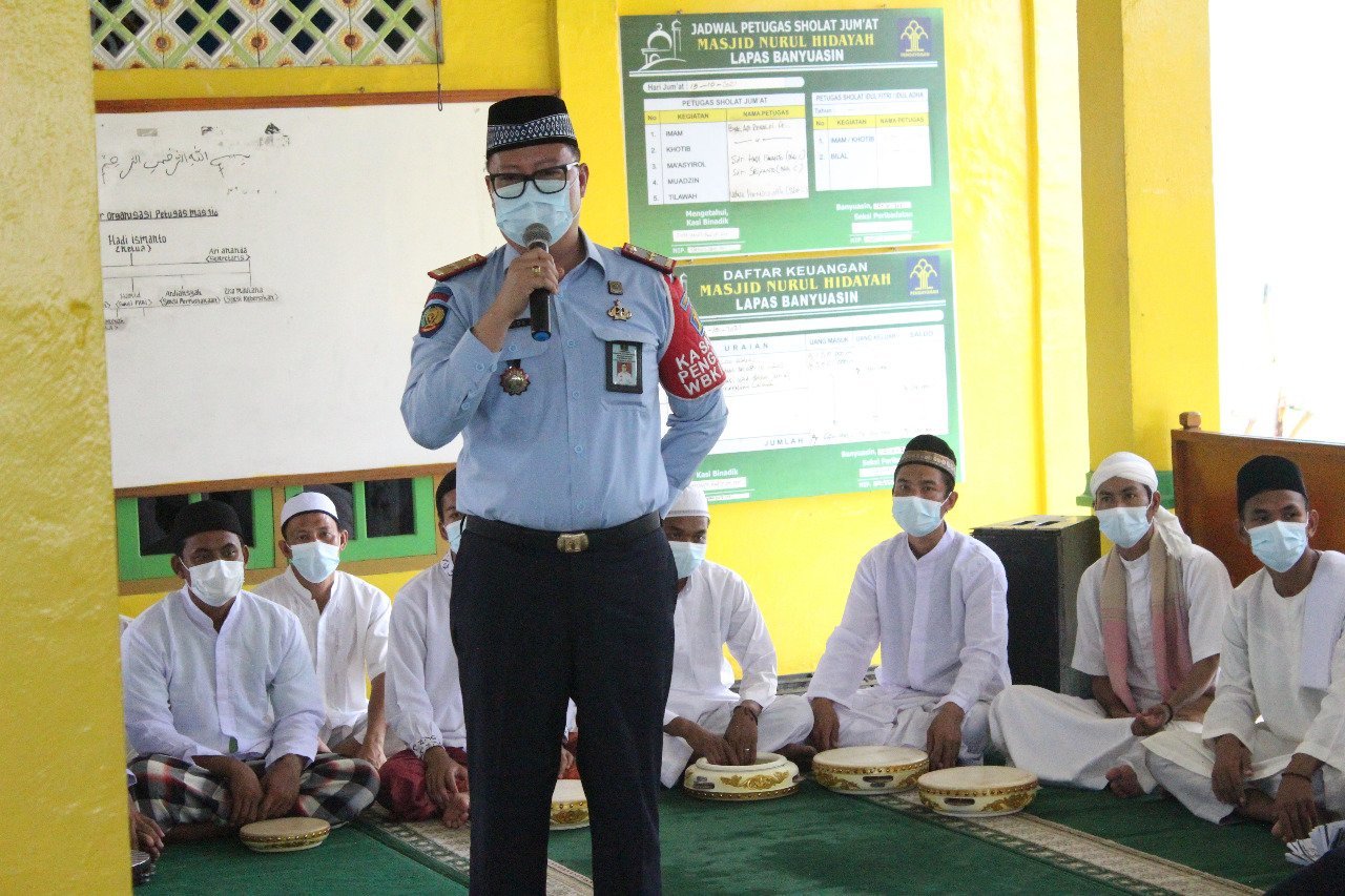 Kegiatan yang berlangsung di Masjid Nurul Hidayah Lapas Banyuasin ini diawali dengan penampilan kesenian hadrah oleh WBP Lapas Kelas IIA Banyuasin yang dilanjutkan dengan sambutan dari Kapala Lapas Ronaldo Devinci Talesa, A.Md.IP., SH., MH.