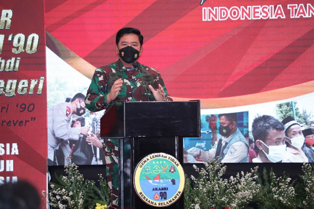 Hal tersebut disampaikan Panglima TNI Marsekal TNI Hadi Tjahjanto, S.I.P., didampingi Kapolri Jenderal Pol Drs. Listyo Sigit Prabowo, M.Si., saat memberikan pembekalan secara langsung kepada para Alumni Akabri 90 maupun secara virtual di 34 Provinsi di Indonesia, pada peringatan 31 Tahun Pengabdian Alumni Akademi Angkatan Bersenjata Republik Indonesia (Akabri) Angkatan tahun 1990, bertempat di Komplek Dasana Indah, Kel. Bojong Nangka, Kec. Kelapa Dua, Kab. Tangerang Selatan, Banten, Selasa (26/10/2021).