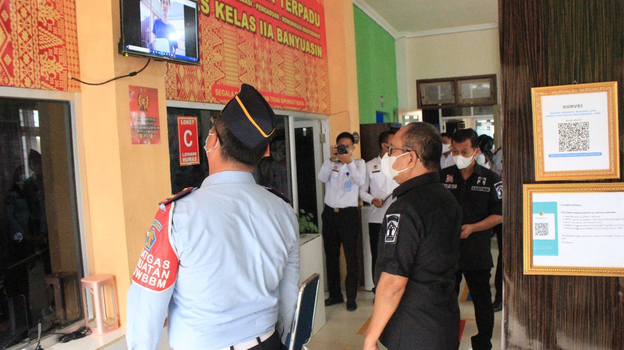 BANYUASIN.KRSumsel.com – Kepala Kantor Wilayah (Kakanwil) Kementerian Hukum dan Hak Asasi Manusia (Kemenkumham) Sumatera Selatan, Indro Purwoko beserta jajaran meninjau penerapan aplikasi Sistem Monitoring Titipan Barang (Simontir) di Lapas Kelas IIA Banyuasin. Rabu (27/10/2021).