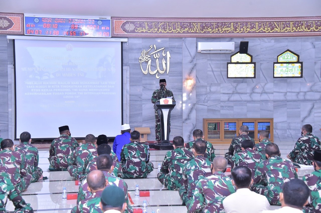 Jakarta, KRsumsel.com – Markas Besar Tentara Nasional Indonesia (Mabes TNI) menggelar peringatan Maulid Nabi Muhammad SAW 1443 H/2021 M, yang diikuti Prajurit dan PNS TNI di lingkungan Mabes TNI, bertempat di Masjid Panglima Soedirman Mabes TNI, Cilangkap, Jakarta Timur, Rabu (3/11/2021).