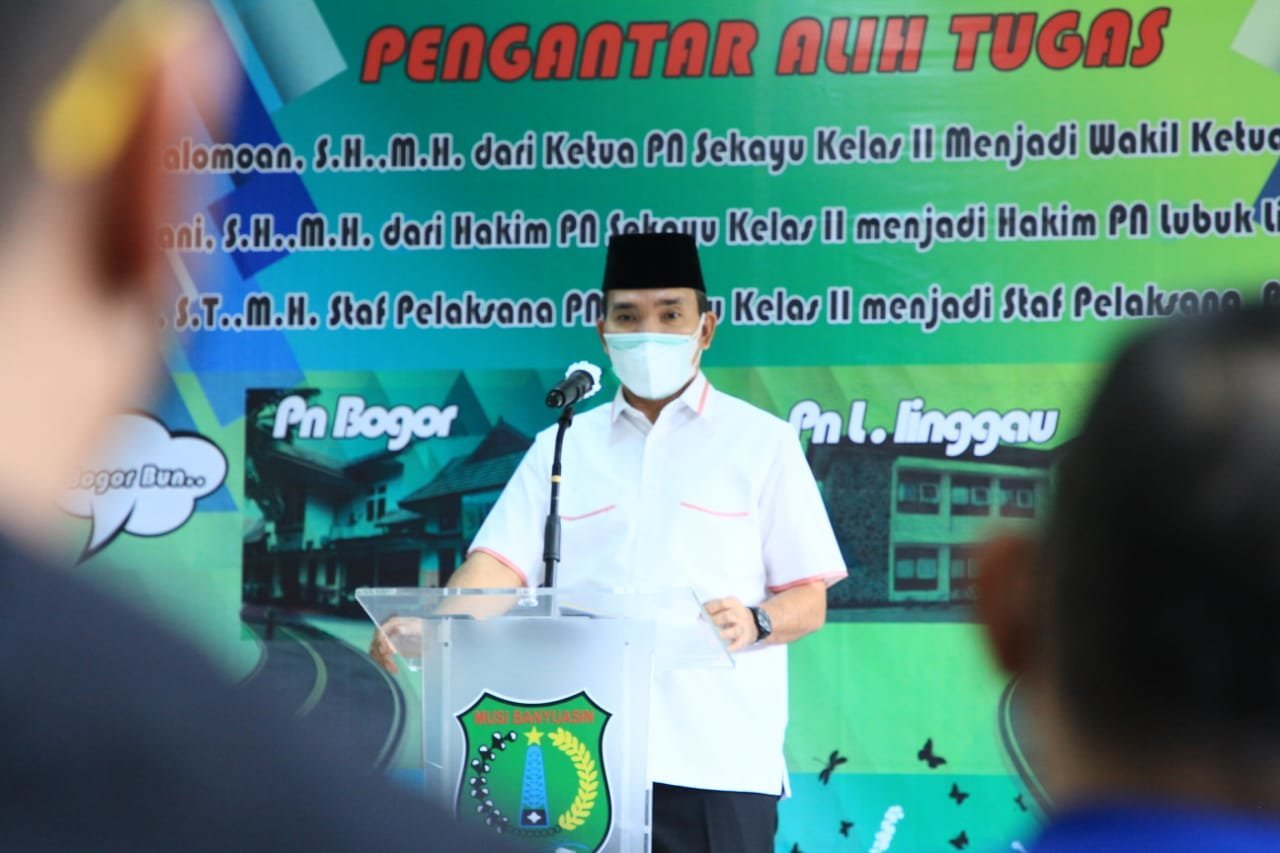 MUBA, KRSUMSEL.com – Pelaksana Tugas (Plt) Bupati Musi Banyuasin (Muba) Beni Hernedi menghadiri acara Pengantar Alih Tugas Ketua Pengadilan Negeri (PN) Sekayu Kelas II Hendra Halomoan SH MH serta Hakim PN Sekayu Kelas II Tyas Listiani SH MH dan Staf Pelaksana PN Sekayu Kelas II Novi Liana ST MH bertempat di ruang Sidang Kartika PN Sekayu, Kamis (4/11/2021).
