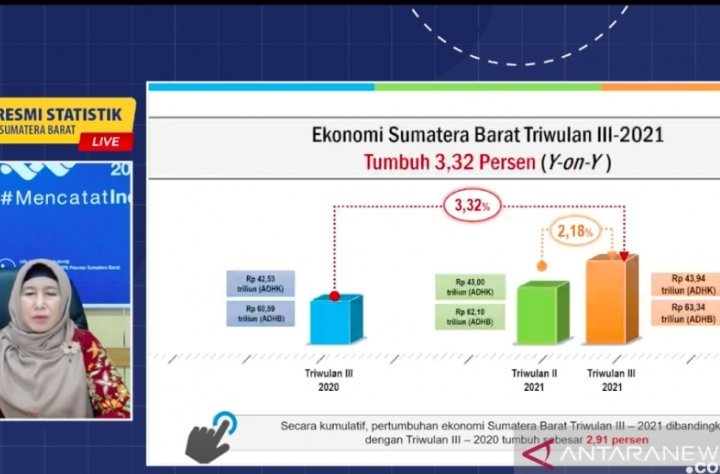 Padang, KRsumsel.com – Badan Pusat Statistik (BPS) Provinsi Sumatera Barat mencatat ekonomi wilayah ini pada triwulan III-2021 tumbuh 3,32 persen dibandingkan periode yang sama pada 2020 dan meningkat 2,18 persen dibandingkan triwulan sebelumnya.